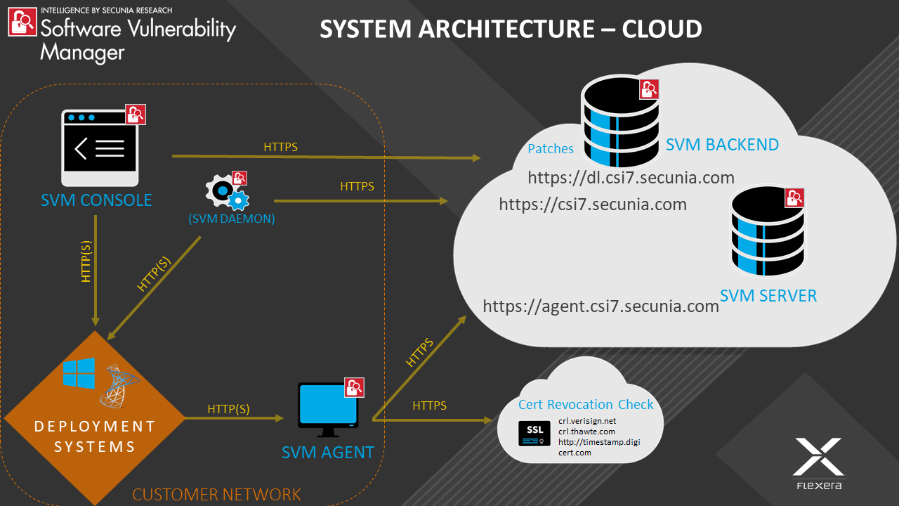 The Software Vulnerability Manager Agent requires network connectivity (HTTP/HTTPS) to https://csi7.secunia.com.