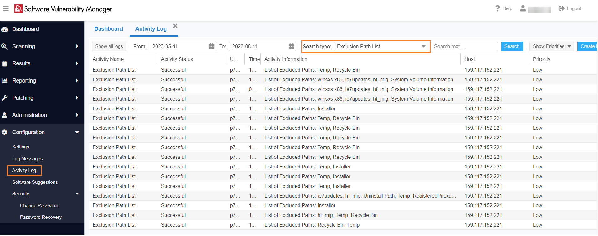 The excluded paths can be viewed in the Configuration > Activity Log grid by selecting Search type as Exclusion Path List .