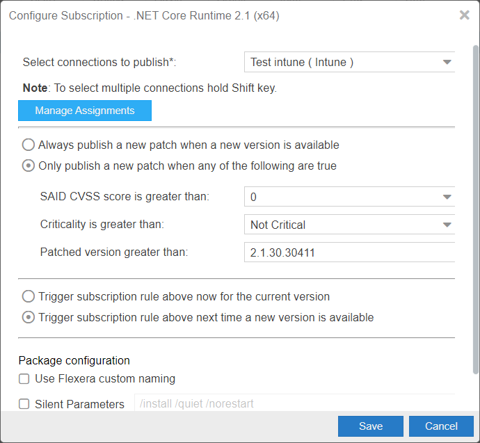 • To make assignments for end point deployments for Intune publishing, click Manage Assignments . The Manage Assignments dialog box appears.