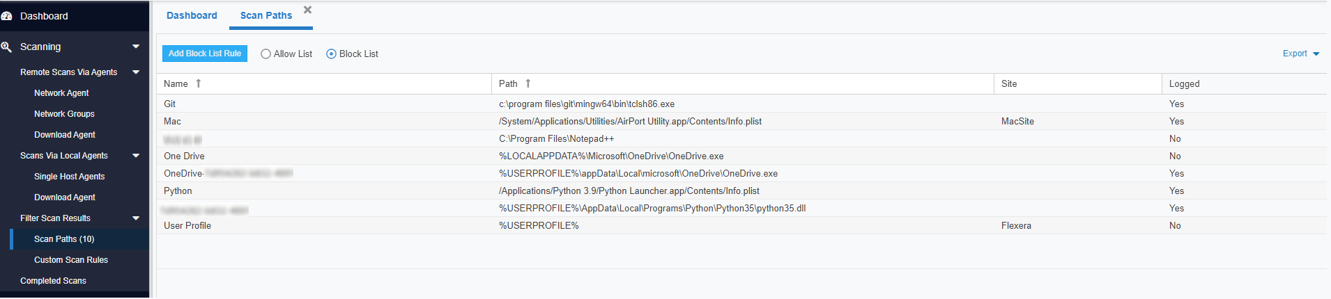 Use this feature to create either a Allow list or Block list of paths/locations to restrict the locations inspected by the Software Vulnerability Manager scan.