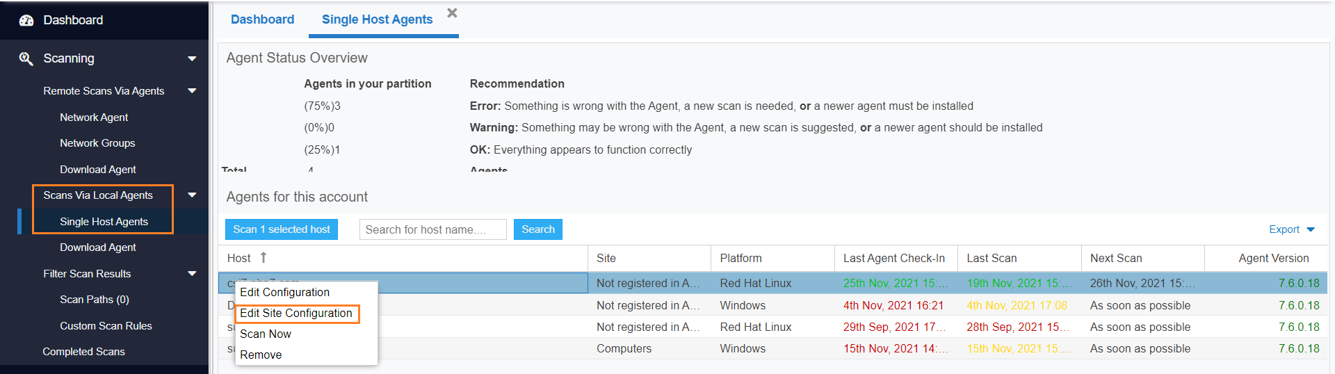 - Manage configurations and schedule scans for the hosts where the Agent is installed as a service in Single Host mode.